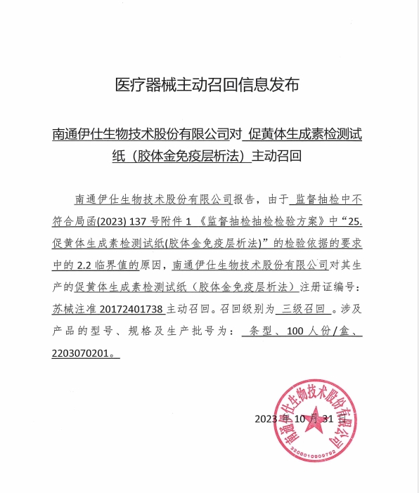 近期,南通伊仕生物技術股份有限公司生產(chǎn)的排卵檢測試紙,因第三方檢驗判定產(chǎn)品不符合技術要求中的2.2臨界值。