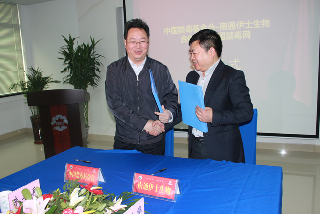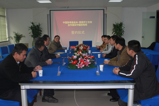 2013年12月7日上午,南通市伊士生物技術有限責任公司在伊士生物研究院會議室舉行了“中國禁毒基金會-南通伊士生物合作建設中國禁毒網簽約儀式”。中國禁毒基金會秘書長李憲輝先生,江蘇省公安廳禁毒總隊副總隊長陳紅淦先生,省公安廳和市公安局相關領導共7人出席了簽約儀式。