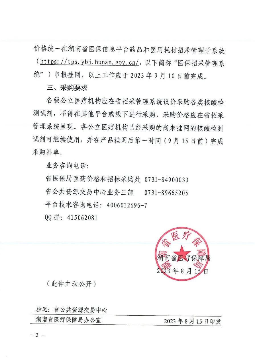 2023年8月16日,湖南省醫保局發布《關于核酸檢測試劑實行陽光掛網采購有關事項的通知》,要求相關生產企業將用于各類核酸檢測的上市試劑產品(新型冠狀病毒核酸檢測類除外)于2023年9月10日前,以湖南省醫療機構實際交易最低價在湖南醫保招采管理系統申報掛網。