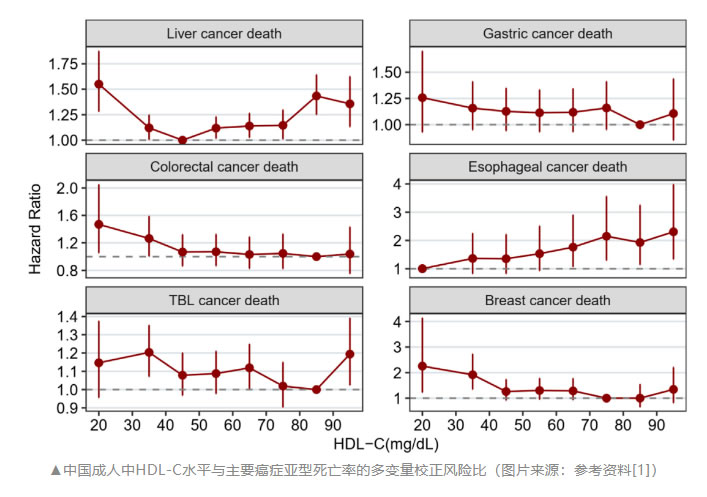 關(guān)于位點特異性癌癥,研究者僅在HDL-C和肝癌死亡率之間發(fā)現(xiàn)了U形關(guān)聯(lián)。與參考水平40 mg/dL~49 mg/dL相比,HDL-C<30 mg/dL(HR 1.55,95% CI:1.28~1.87)和>80 mg/dL(HR高于1.35,95% CI高于1.10)與肝癌死亡風險較高相關(guān)。此外,HDL-C<40 mg/dL(HR 高于 1.90,95% CI 高于 1.20)受試者的乳腺癌死亡率顯著更高,而HDL-C>70 mg/dL的受試者的食管癌死亡率顯著更高(HR高于1.90,95% CI高于1.10)。