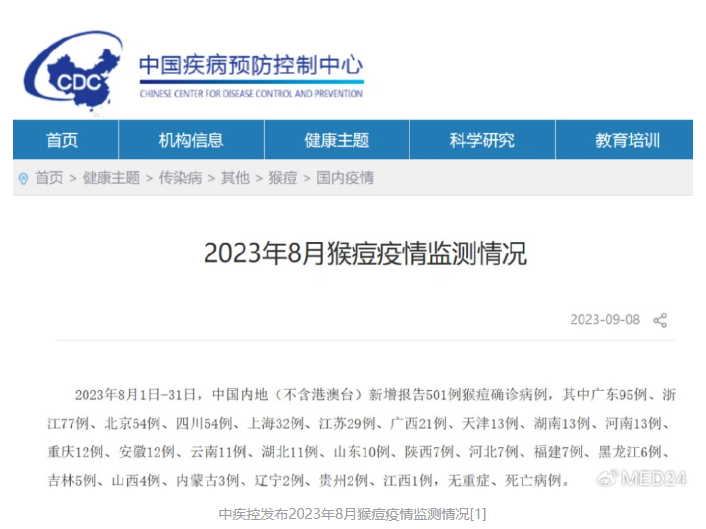 9月8日,中疾控發布8月猴痘疫情監測情況[1]。2023年8月1日-31日,中國內地(不含港澳臺)新增報告501例猴痘確診病例,相較7月增加10例。
